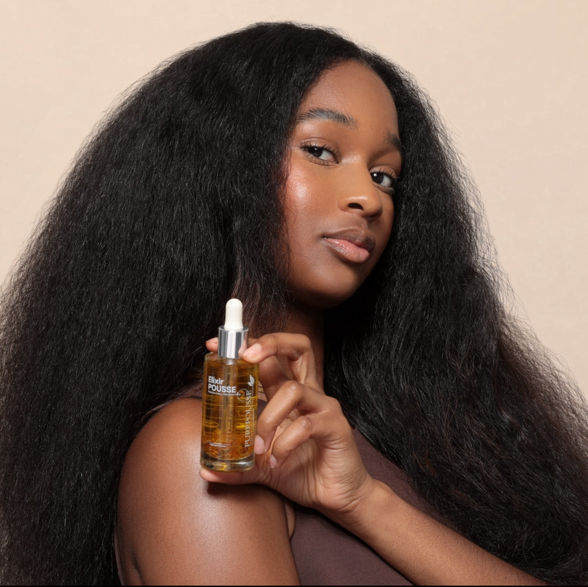 L’Élixir Pousse est une huile capillaire concentrée formulée à 99 % d’ingrédients naturels et bio, spécialement conçue pour stimuler la pousse des cheveux afro, crépus, frisés et bouclés tout en renforçant leur santé. Véritable synergie d’huiles végétales, d’huiles essentielles et d’extraits de plantes, ce soin active la micro-circulation du cuir chevelu grâce à l’huile essentielle de menthe poivrée, favorisant une croissance plus forte et durable. Il aide à lutter contre la casse, apaise les démangeaisons et nourrit intensément la fibre capillaire pour des cheveux plus résistants, doux et brillants. Idéal pour les cheveux secs, fragiles, abîmés ou sujets aux zones clairsemées comme les tempes, cet élixir protège, assouplit et sublime la chevelure au quotidien tout en soutenant une pousse saine.